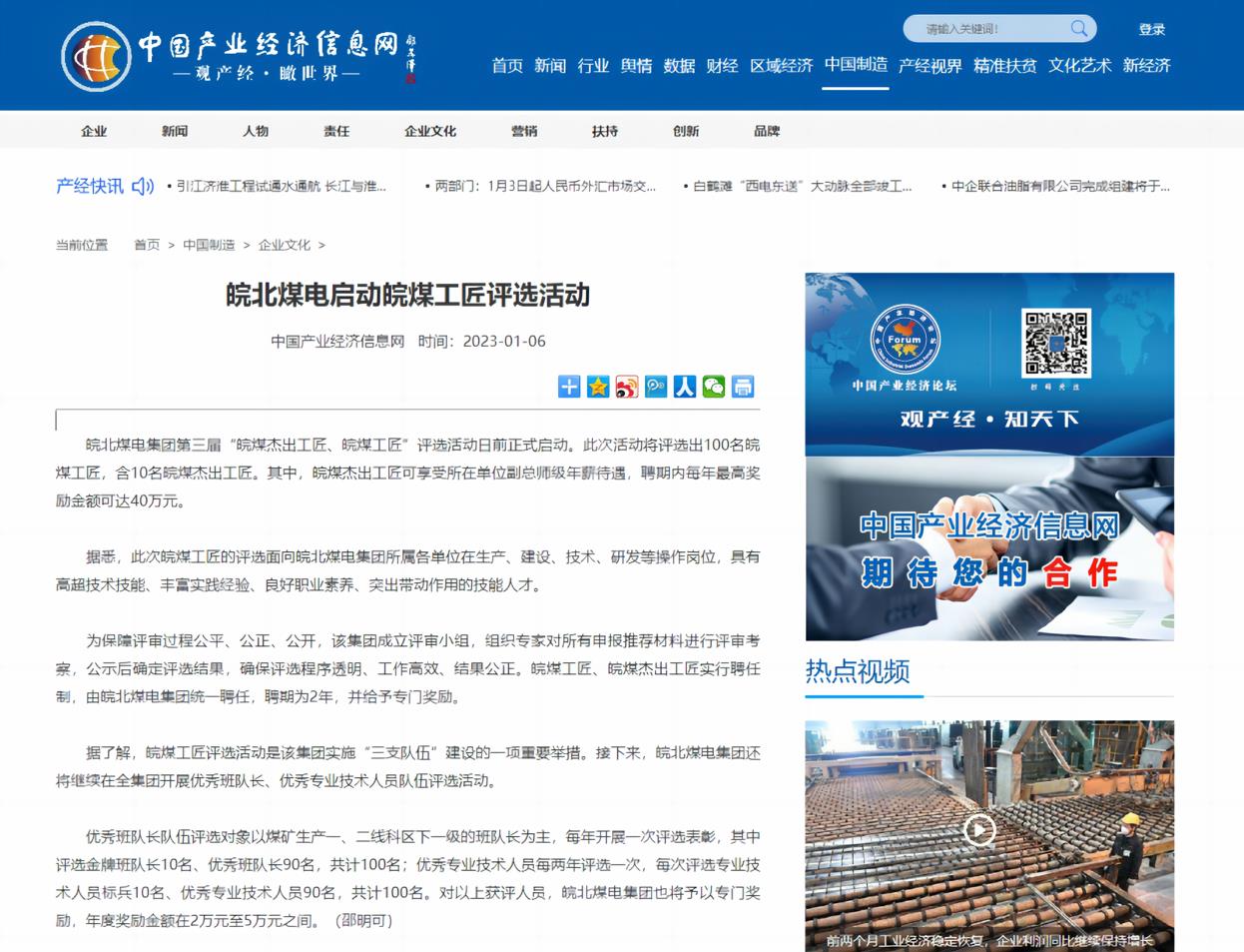 1月6日中國產(chǎn)業(yè)經(jīng)濟信息網(wǎng):皖北煤電啟動皖煤工匠評選活動