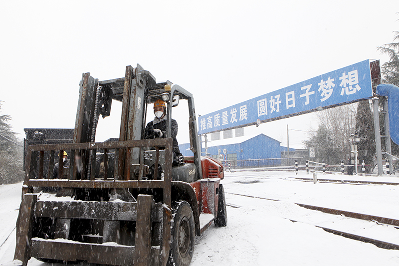 圖一:皖北煤電集團(tuán)恒源煤礦生產(chǎn)準(zhǔn)備區(qū)職工正駕駛叉車冒雪來回運(yùn)輸物資、材料。