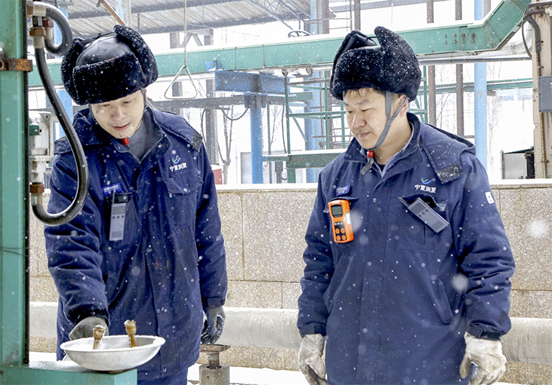 圖片說明:2月3日,寧夏中衛(wèi)市迎來了強(qiáng)降雪天氣,天寒地凍、白雪飛舞,寧夏潤夏能源化工公司濃硝酸車間三組現(xiàn)場巡檢人員在裝置現(xiàn)場檢查重大危險源硝酸罐區(qū)洗眼器出水是否正常。
